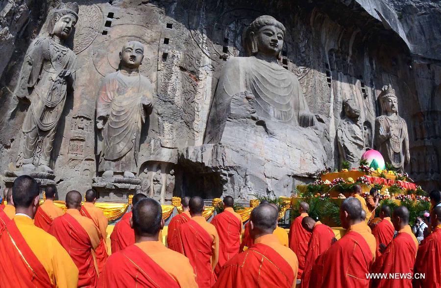 Monks take part in a prayer meeting at the Longmen Grottoes in Luoyang, central China's Henan Province, May 19, 2012. Luoyang, one of the cradles of Chinese civilization and one of the "Four Great Ancient Capitals of China", tries to integrate its tourism spots, an effort to build a "Chinese Culture City."(Xinhua/Wang Song)