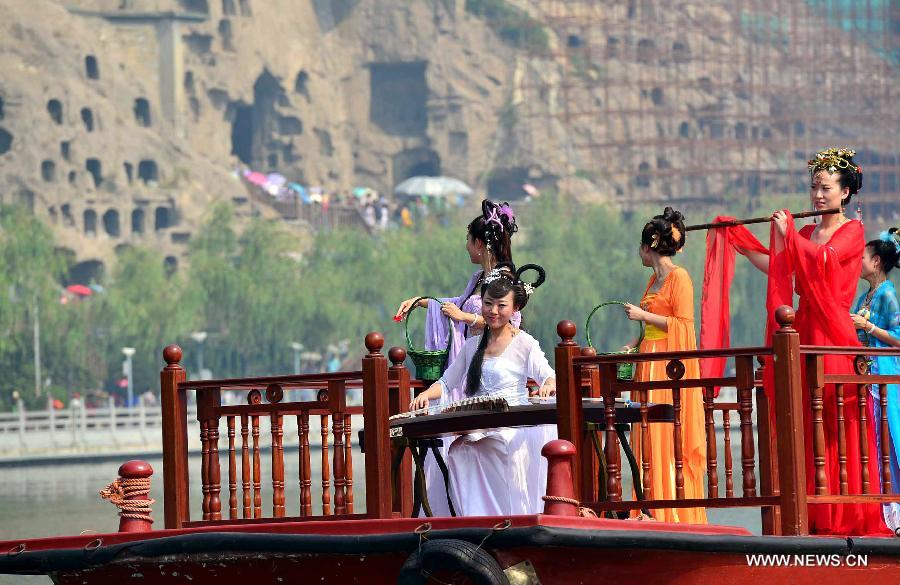 Actresses perform ancient music on a boat at the Longmen Grottoes in Luoyang, central China's Henan Province, Aug. 10, 2013. Luoyang, one of the cradles of Chinese civilization and one of the "Four Great Ancient Capitals of China", tries to integrate its tourism spots, an effort to build a "Chinese Culture City."(Xinhua/Wang Song)