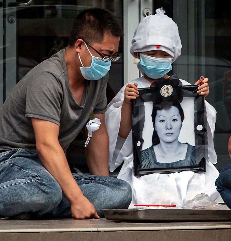 | Jin Zhongqing, whose wife Wu Shuoyan was beaten to death at a McDonald’s in east China, and his 7-year-old son mourn for her in Zhaoyuan. Traditionally, Chinese believe that souls return on the seventh day after death to bid a final farewell. (Photo/Shanghai Daily) |