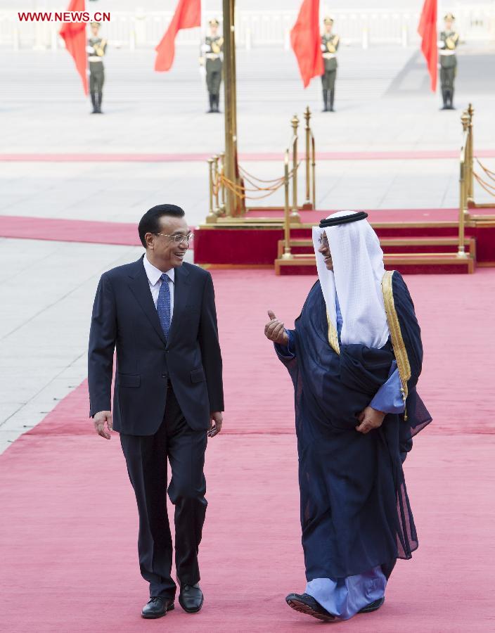 Chinese Premier Li Keqiang (L) holds a welcoming ceremony for Kuwaiti Prime Minister Sheikh Jaber Al-Mubarak Al-Hamad Al-Sabah before their talks in Beijing, capital of China, June 3, 2014. (Xinhua/Huang Jingwen)