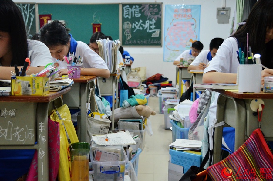 There are signs and slogans stuck on the walls of the classrooms and the hall. Reading materials are piled up beside the desks. Some students are busy with reviewing; some are dealing with unsolved problems and some are consulting with their teachers. They try to adjust themselves to the best status to face the crucial moment in their life.