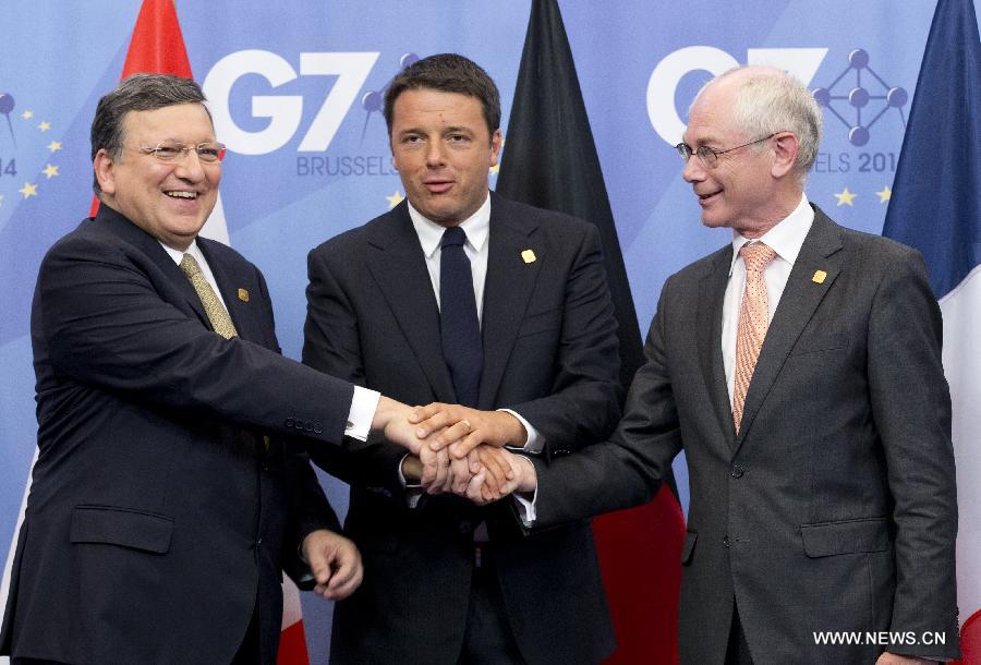 President of the European Commission Jose Manuel Barroso (L) and European Council President Herman Van Rompuy (R) welcome Italian Prime Minister Matteo Renzi (C) during the G7 summit in Brussels, Belgium, June 4, 2014. (Xinhua/The Council of the European Union)