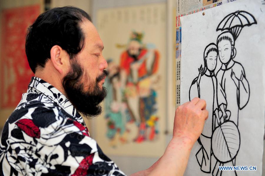 Shi Jianting, the sixth generation successor of Gaomi ash-patting new year painting, draws a sketch at a studio in Gaomi, east China's Shandong Province, June 1, 2014. Gaomi ash-patting new year painting is a traditional art craft which has enjoyed a history of over 500 years and only existed in Gaomi. It has been included in the list of national intangible cultural heritages. (Xinhua/Guo Xulei)