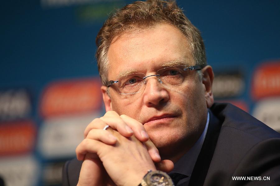 FIFA's general secretary Jerome Valcke attends a press conference following a meeting of the FIFA Organising Committee for the World Cup 2014 in Sao Paulo, Brazil, on June 5, 2014. Sao Paulo will host the opening match of the World Cup on June 12. (Xinhua/Rahel Patrasso)