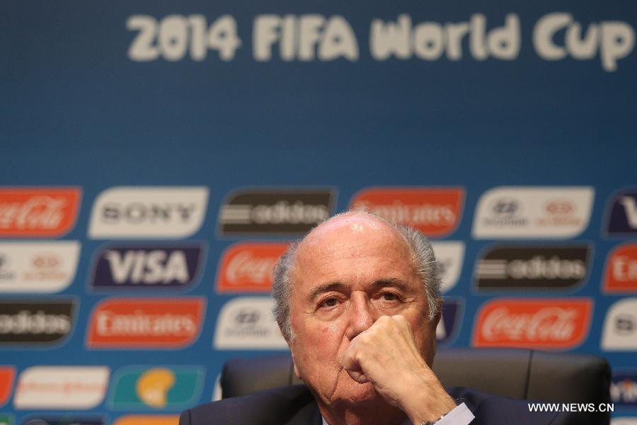 FIFA's president Joseph Blatter attends a press conference following a meeting of the FIFA Organising Committee for the World Cup 2014 in Sao Paulo, Brazil, on June 5, 2014. Sao Paulo will host the opening match of the World Cup on June 12. (Xinhua/Rahel Patrasso)