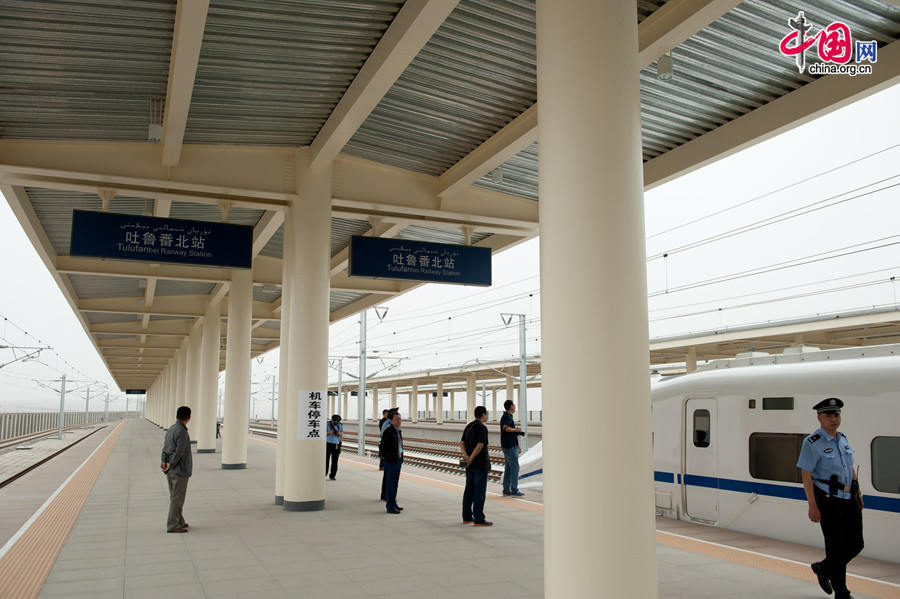 A CRH train stops at Tulufan North Station for an overall system examination after completing the first half of a system integration test run It will return to its base in Urumqi, the capital of Xinjiang Uygur Autonomous Region. [Photo by Chen Boyuan / China.org.cn]
