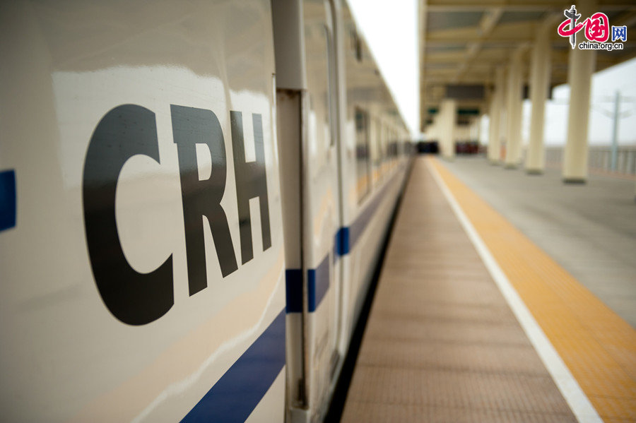A CRH train stops at Tulufan North Station for an overall system examination after completing the first half of a system integration test run It will return to its base in Urumqi, the capital of Xinjiang Uygur Autonomous Region. [Photo by Chen Boyuan / China.org.cn]