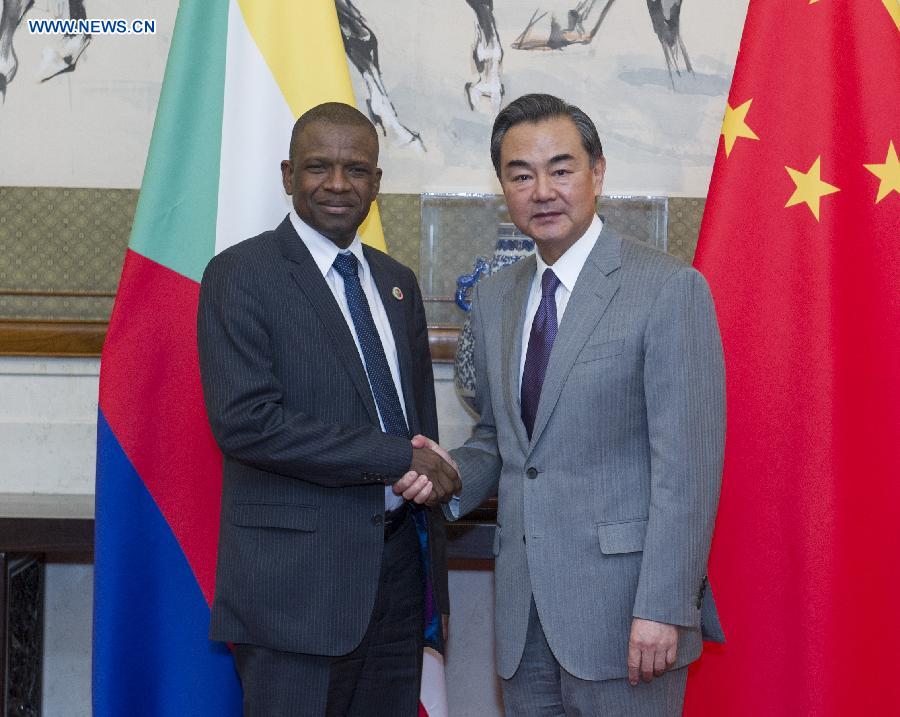 | Chinese Foreign Minister Wang Yi (R) meets with his Comoran counterpart El-Anrif Said Hassane at the Diaoyutai State Guesthouse in Beijing, capital of China, June 6, 2014. (Xinhua/Wang Ye) |