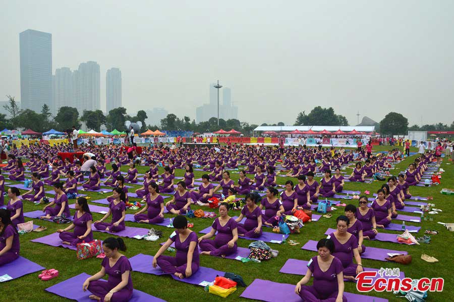 A total of 505 pregnant women set a new Guinness World Record on yoga at a park in Changsha of central China's Hunan province on June 8, 2014. The 505 participants practiced yoga for 37 minutes and 28 seconds, breaking the record in 2013 in Shenzhen which involved 423 pregnant women. According to Guinness certification officer Cheng Dong, to set the new record, all the participants are expected to be over 12 weeks in pregnancy with medical certificates and their challenge lasts no less than 30 minutes. (Photo/China News Service)