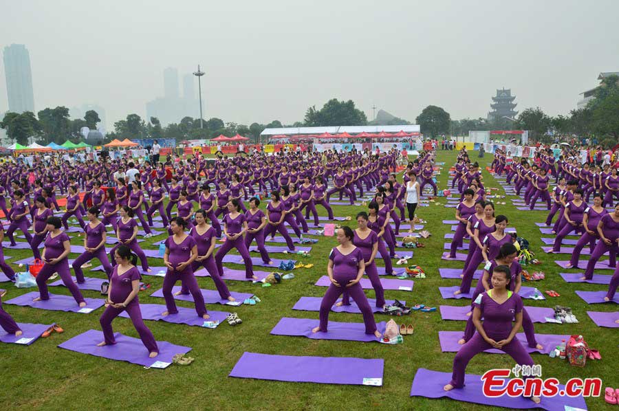 A total of 505 pregnant women set a new Guinness World Record on yoga at a park in Changsha of central China's Hunan province on June 8, 2014. The 505 participants practiced yoga for 37 minutes and 28 seconds, breaking the record in 2013 in Shenzhen which involved 423 pregnant women. According to Guinness certification officer Cheng Dong, to set the new record, all the participants are expected to be over 12 weeks in pregnancy with medical certificates and their challenge lasts no less than 30 minutes. (Photo/China News Service)