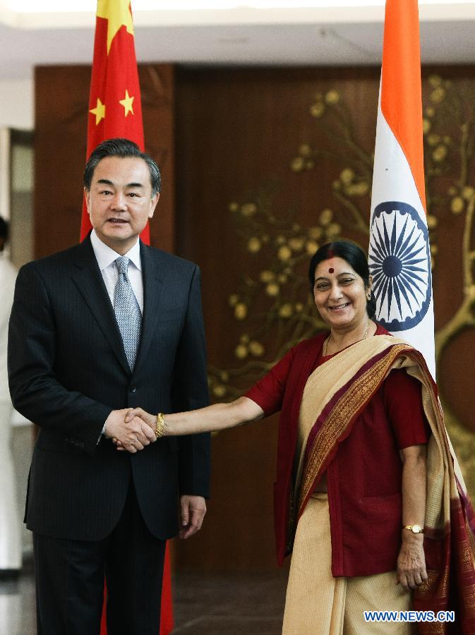 | Visiting Chinese Foreign Minister Wang Yi (L) meets with Indian Minister of External Affairs Sushma Swaraj in New Delhi, India, June 8, 2014. (Xinhua/Zheng Huansong) |