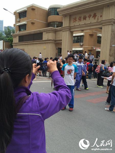 A parent takes photos for his child after finishing the National College Entrance Exam (NCEE) on June 8, 2014. (People’s Daily Online/ Wang Xin)