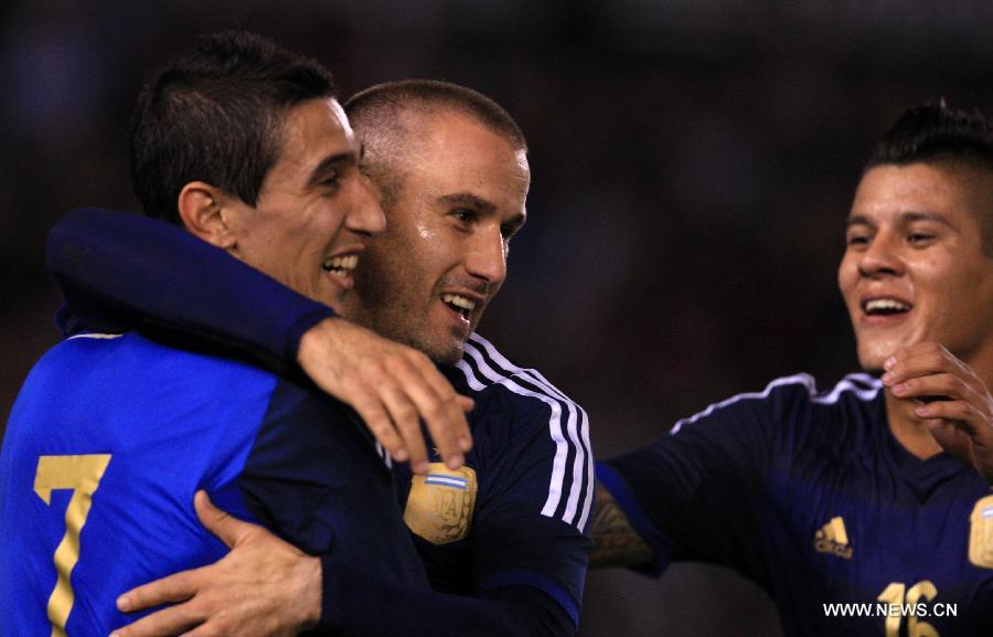 Argentina's Rodrigo Palacio (C) celebrates after scoring, with his teammates Angel Di Maria (L) and Marcos Rojo (R), during a friendly match against Trinidad and Tobago, prior to the 2014 Brazil FIFA World Cup, held at the Monumental Stadium, in Buenos Aires, Argentina, on June 4, 2014. (Xinhua/Martin Zabala)