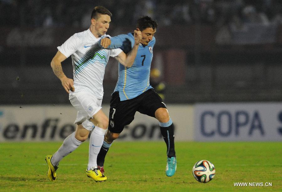Uruguay's Cristian Rodriguez vies for the ball with Slovenia's Rajko Rotman (L) during a friendly match prior to the 2014 FIFA World Cup, held at the Centenario Stadium, in Montevideo, capital of Uruguay, on June 4, 2014. (Xinhua/Nicolas Celaya)