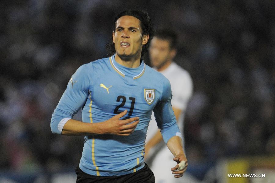 Uruguay's Edinson Cavani celebrates after scoring during a friendly match against Slovenia, prior to the 2014 FIFA World Cup, held at the Centenario Stadium, in Montevideo, capital of Uruguay, on June 4, 2014. (Xinhua/Nicolas Celaya)