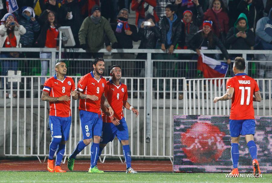 Chile's Mauricio Pinilla (2nd L) celebrates after scoring during a friendly match against Northern Ireland, prior to the 2014 FIFA World Cup, held at Elias Figueroa Brander Stadium, in Valparaiso, Chile, on June 4, 2014. (Xinhua/Str)