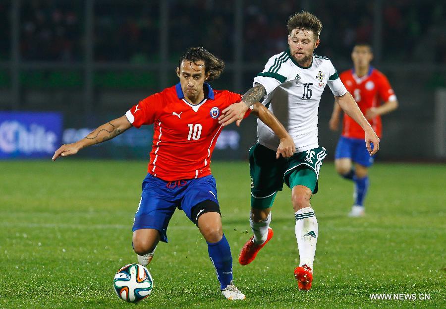 Chile's Jorge Valdivia (L) vies for the ball with Oliver Norwood of Northern Ireland during a friendly match prior to the 2014 FIFA World Cup, held at Elias Figueroa Brander Stadium, in Valparaiso, Chile, on June 4, 2014. (Xinhua/Str)