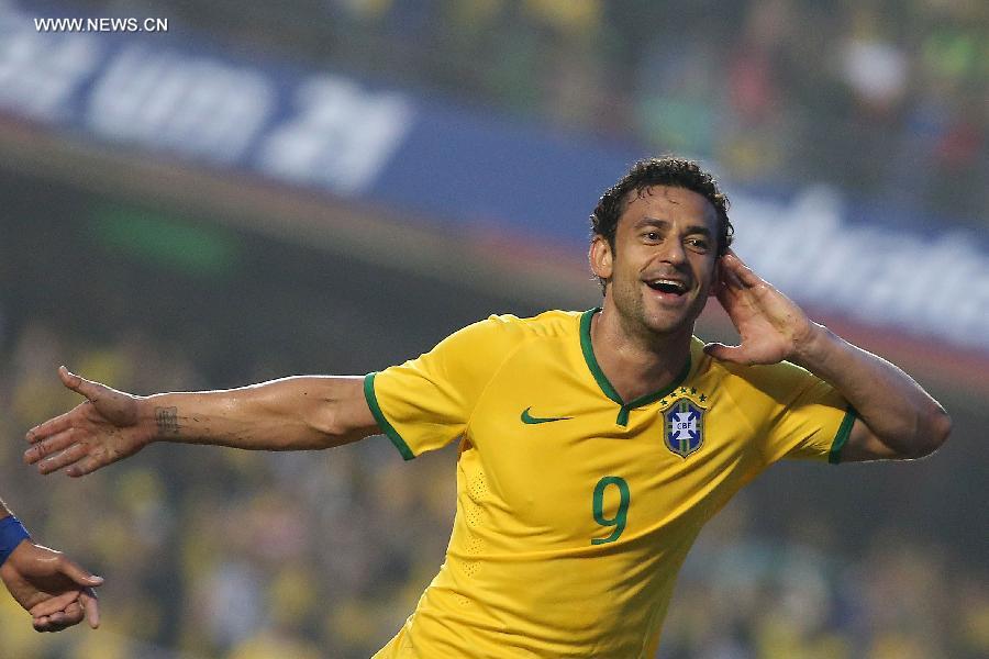 Brazil's Fred celebrates after scoring against Serbia during the friendly match previous to the FIFA World Cup held on the Morumbi Stadium in Sao Paulo, Brazil, on June 6, 2014. (Xinhua/Rahel Patrasso)