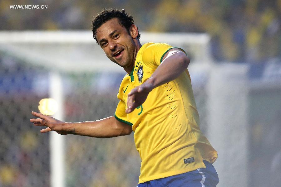 Brazil's Fred celebrates after scoring against Serbia during the friendly match previous to the FIFA World Cup held on the Morumbi Stadium in Sao Paulo, Brazil, on June 6, 2014. (Xinhua/Rahel Patrasso)