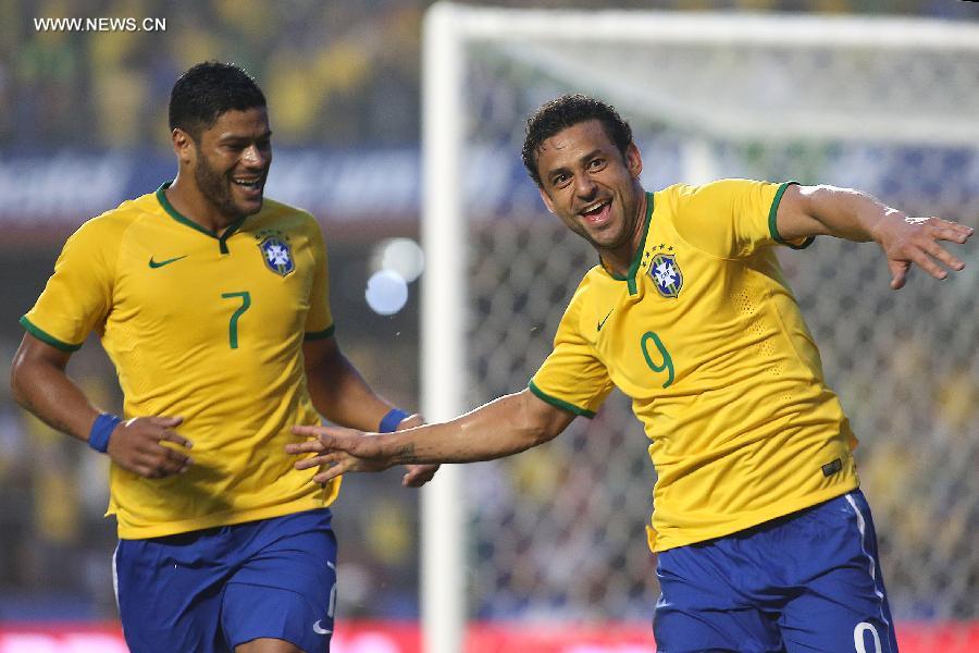 Brazil's Fred (R) celebrates after scoring against Serbia during the friendly match previous to the FIFA World Cup held on the Morumbi Stadium in Sao Paulo, Brazil, on June 6, 2014. (Xinhua/Rahel Patrasso)