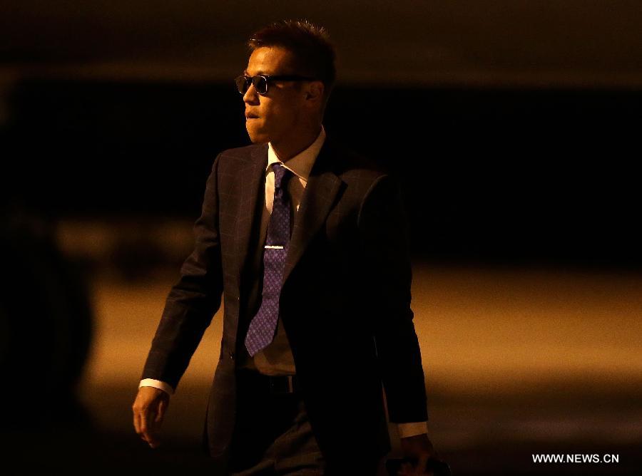 Keisuke Honda of Japan's national soccer team walks out as the team arrive at the Viracopos airport prior of the 2014 World Cup in Campinas, Brazil, June 7, 2014. (Xinhua/Liao Yujie)