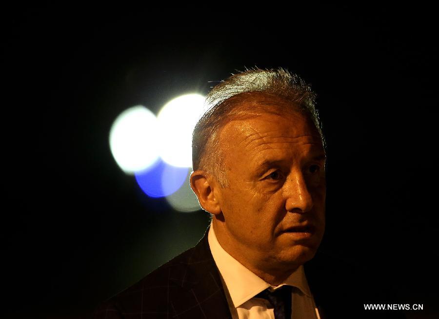 Coach Zaccheroni Alberto of Japan's national soccer team speaks to media as the team arrive at the Viracopos airport prior of the 2014 World Cup in Campinas, Brazil, June 7, 2014. (Xinhua/Liao Yujie)