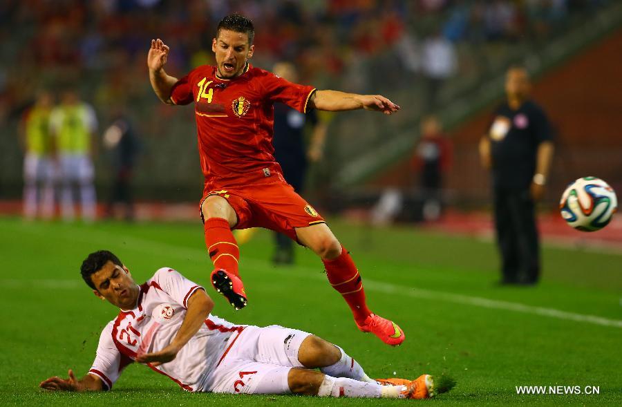 | Belgium's Dries Mertens (R) breaks through during a friendly soccer match against Tunisia in Brussels, on June 7, 2014. Belgium won 1-0. (Xinhua/Gong Bing) |