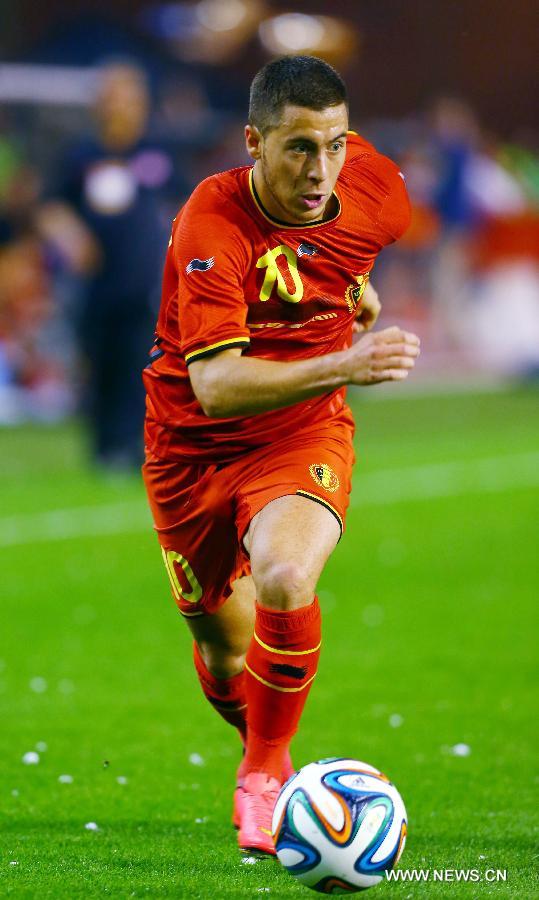 Belgium's Eden Hazard controls the ball during a friendly soccer match against Tunisia in Brussels, on June 7, 2014. Belgium won 1-0. (Xinhua/Gong Bing)