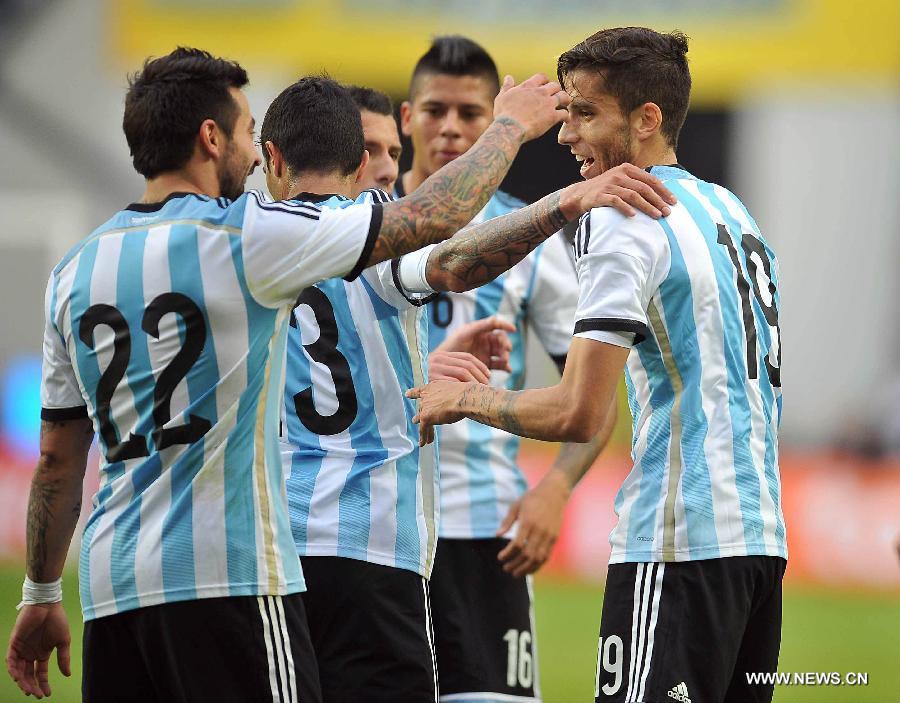 Argentina's Ricardo Alvarez (R) celebrates after scoring with his teammates during the friendly match against Slovenia prior to the FIFA World Cup at Ciudad de La Plata Stadium, in La Plata, Argentina, on June 7, 2014. (Xinhua/Victor Carreira/TELAM)
