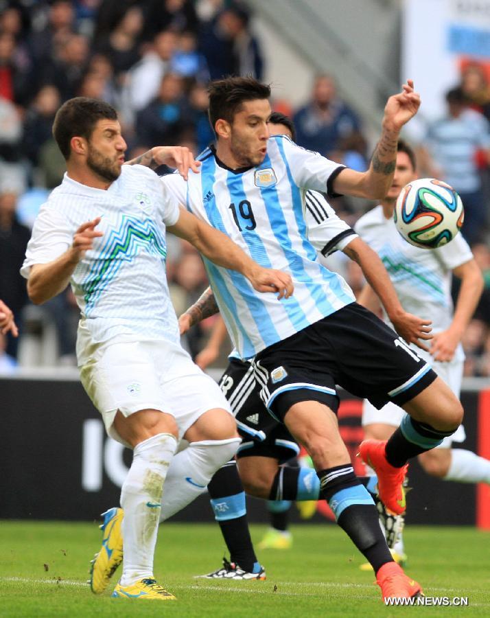 Argentina's Ricardo Alvarez (R) vies for the ball with Miral Samardzic of Slovenia during a friendly match prior to the FIFA World Cup at Ciudad de La Plata Stadium, in La Plata, Argentina, on June 7, 2014. (Xinhua/Victor Carreira/TELAM)