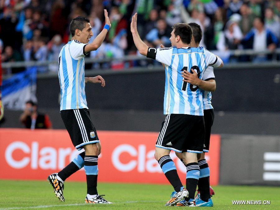 | Argentina's Lionel Messi (C) celebrates after scoring with his teammates Sergio Aguero (R) and Angel Di Maria during the friendly match against Slovenia prior to the FIFA World Cup at Ciudad de La Plata Stadium, in La Plata, Argentina, on June 7, 2014. (Xinhua/Victor Carreira/TELAM) |