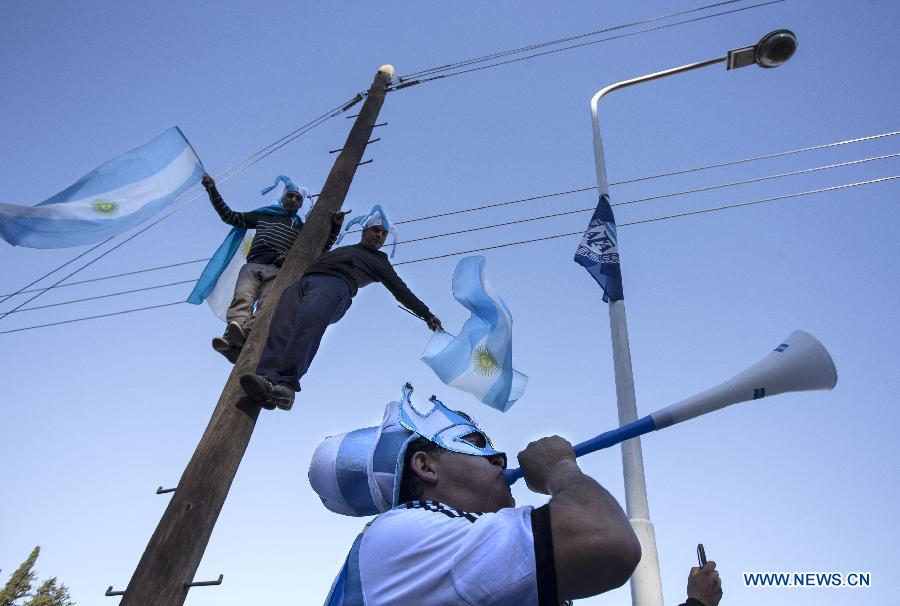 A man plays an instrument during the farewell to Argentina's national soccer team players who will travel to Brazil's Belo Horizonte to take part in the 2014 FIFA World Cup, in Ezeiza, 30km north of Buenos Aires, capital of Argentina, on June 9, 2014. (Xinhua/Martin Zabala)