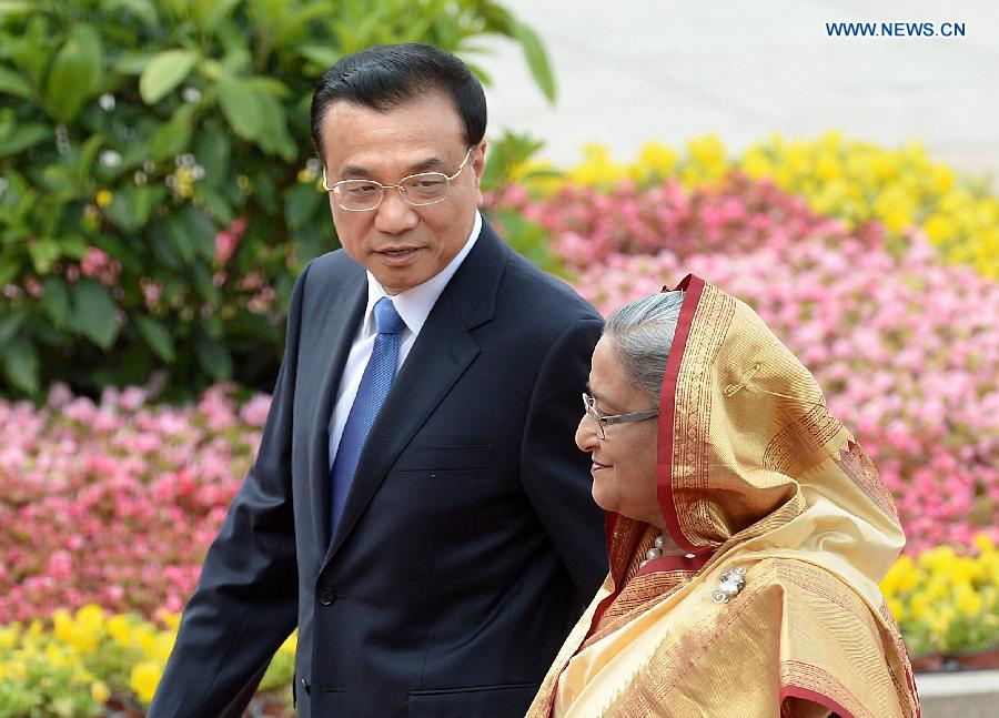 Chinese Premier Li Keqiang (L) holds a welcoming ceremony for visiting Prime Minister of Bangladesh Sheikh Hasina Wajed before their talks in Beijing, capital of China, June 9, 2014. (Xinhua/Ding Lin)
