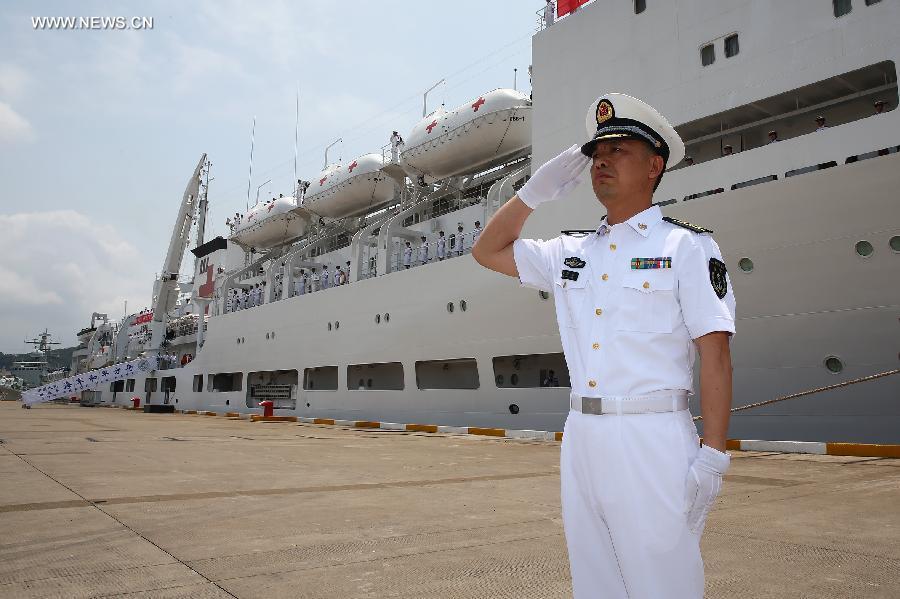 Zhang Ronghua, captain of China's hospital ship Peace Ark, prepares for sailing at a naval port in Zhoushan, east China's Zhejiang Province, June 9, 2014. The Chinese navy will participate in the Rim of the Pacific (RIMPAC) multinational naval exercises for the first time. A missile destroyer, a missile frigate, a supplier ship and a hospital ship of the Chinese navy left for the United States on Monday to attend the exercises. (Xinhua/Ju Zhenhua)