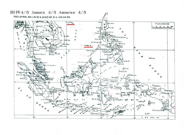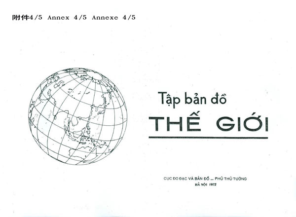 Annex 4/5: Cover of the World Atlas printed in May 1972 by the Bureau of Survey and Cartography under the Office of the Premier of Vietnam, and the page on the Philippines, Malaysia, Indonesia and Singapore.