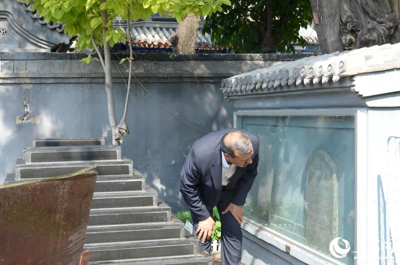 Cultural Counselor of the Embassy of Iran in China Hossein Jalivand looks at the characters carved on the steles in Niujie Mosque, June 3, 2014. (People's Daily Online/Du Mingming)