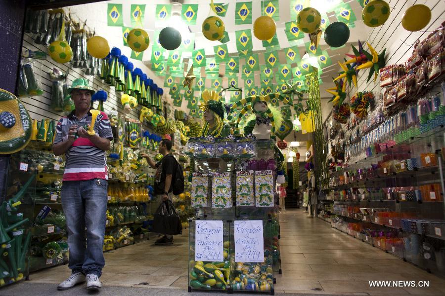 | A man sells souvenirs in downtown Sao Paulo, Brazil, on June 9, 2014. The 2014 FIFA World Cup will be held in Brazil from June 12 to July 13. (Xinhua/Guillermo Arias) |