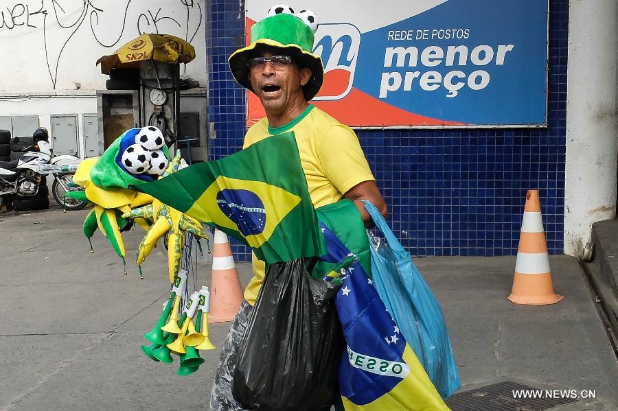 A man sells items from the World Cup down a street in salvador Bahia, June 10 2014. The World Cup 2014 will be held in Brazil from 12 June to 13 July. (Xinhua/Jhon Paz)