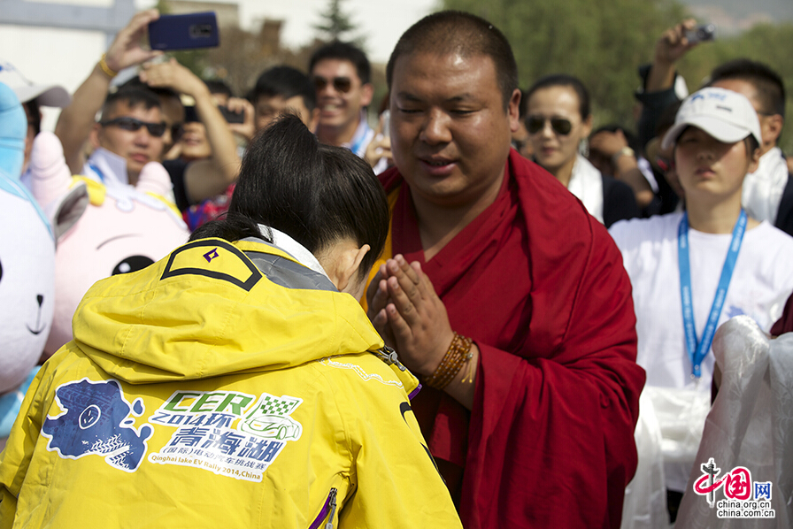 Chinese billiards star Pan Xiaoting attended the blessing ceremony of the first Qinghai Lake Electric Vehicle International Challenge Competition on June 9 in Xining. [Photo by Wu Wenda / China.org.cn]