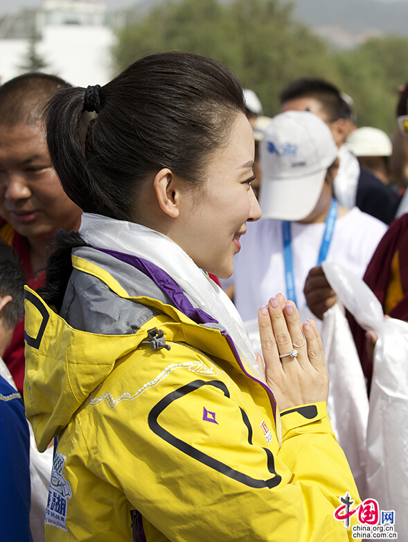 | Chinese billiards star Pan Xiaoting attended the blessing ceremony of the first Qinghai Lake Electric Vehicle International Challenge Competition on June 9 in Xining. [Photo by Wu Wenda / China.org.cn] |