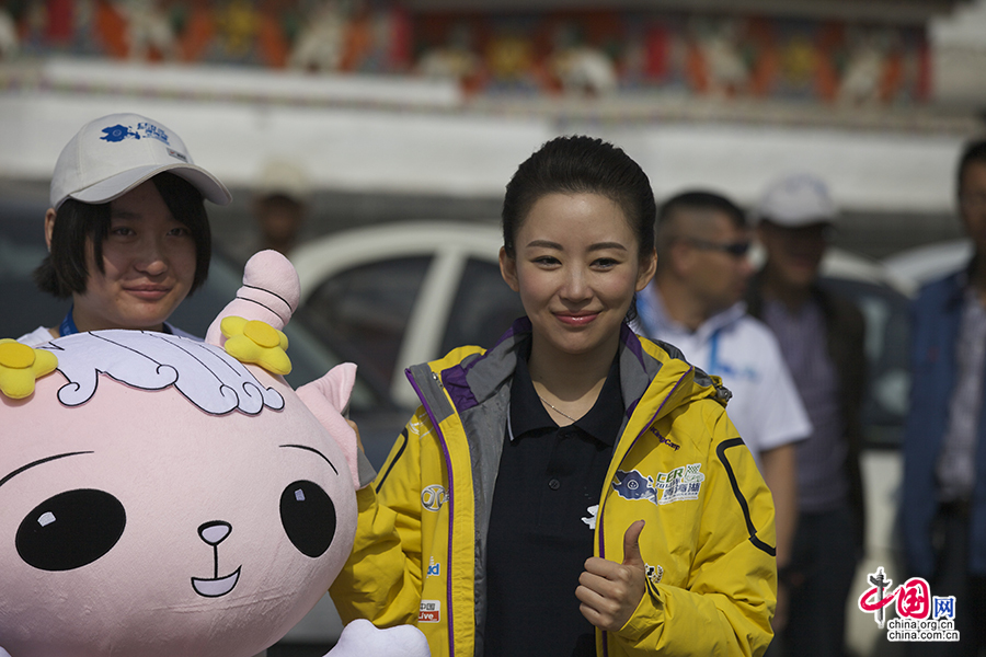 Chinese billiards star Pan Xiaoting attended the blessing ceremony of the first Qinghai Lake Electric Vehicle International Challenge Competition on June 9 in Xining. [Photo by Wu Wenda / China.org.cn]