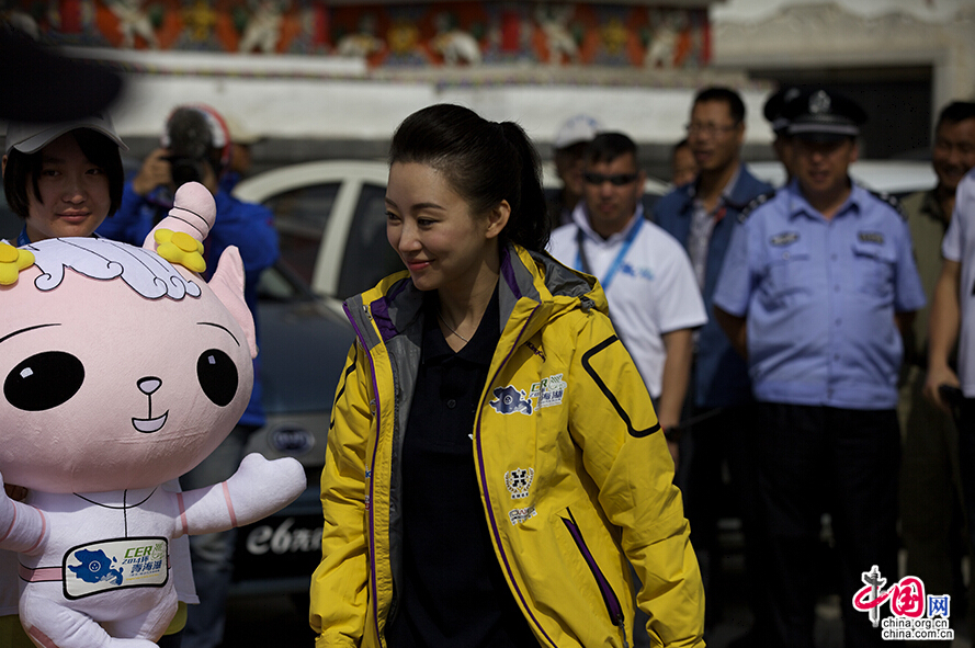 Chinese billiards star Pan Xiaoting attended the blessing ceremony of the first Qinghai Lake Electric Vehicle International Challenge Competition on June 9 in Xining. [Photo by Wu Wenda / China.org.cn]