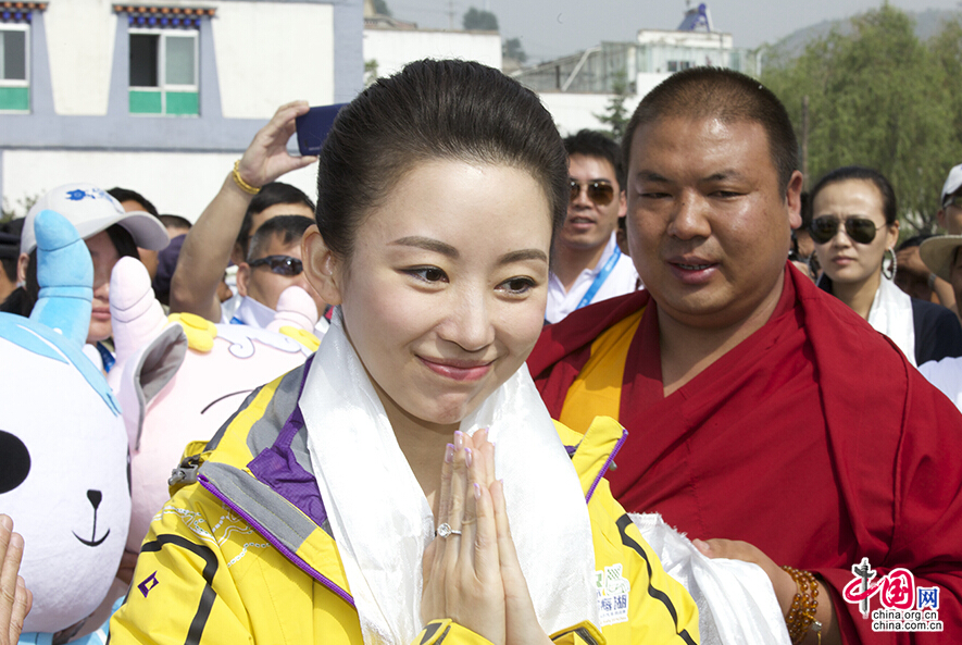 Chinese billiards star Pan Xiaoting attended the blessing ceremony of the first Qinghai Lake Electric Vehicle International Challenge Competition on June 9 in Xining. [Photo by Wu Wenda / China.org.cn]