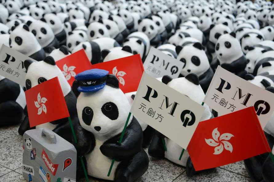 Papier-mache pandas, created by French artist Paulo Grangeon, are seen displayed at the arrival hall of the Hong Kong airport June 9, 2014. The installation arrived in the city on Monday, launching the month-long "1600 Pandas World Tour in Hong Kong: Creativity meets Conservation" organized by a local art organiser, according to the official press release. [Photo/Xinhua]