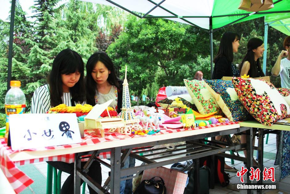 "The Fourth College Students Fashion Market" kicks off on the campus of Lanzhou University, northwest China's Gansu Province on June 9, 2014. Students sold the creative products designed and hand-made by them at the market.