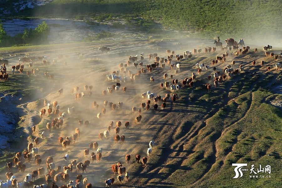 Sheep and cattle are shepherded across grassland during the summer livestock migration in Altay, northwest China’s Xinjiang on June 8, 2014. This year, about 1.5 million cattle and sheep will take 10 days moving to the cooler area in remote mountains in Altay. (Photo/www.ts.cn)