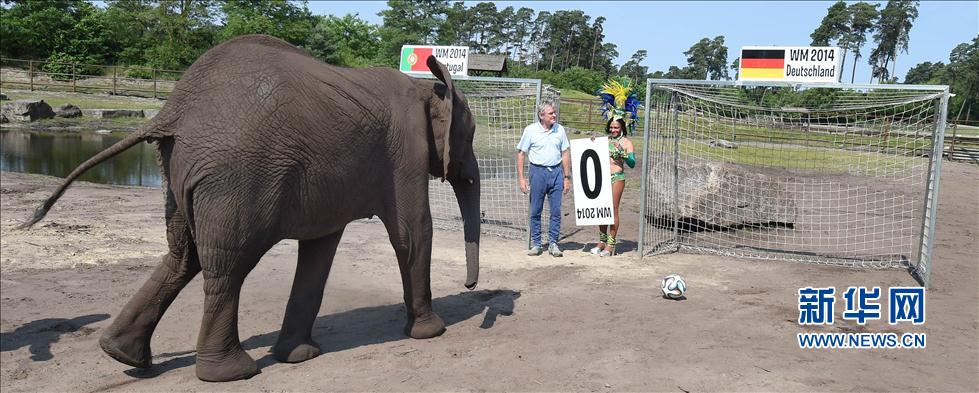 Elephant Nelly plays with a World Cup football at Serengeti Park in Hodenhagen, Germany on June 4, 2014. Nelly predicted a victory for Portugal over Germany during the group match of the World Cup by kicking the ball into the Portuguese goal. (Xinhua News Agency/AFP)
