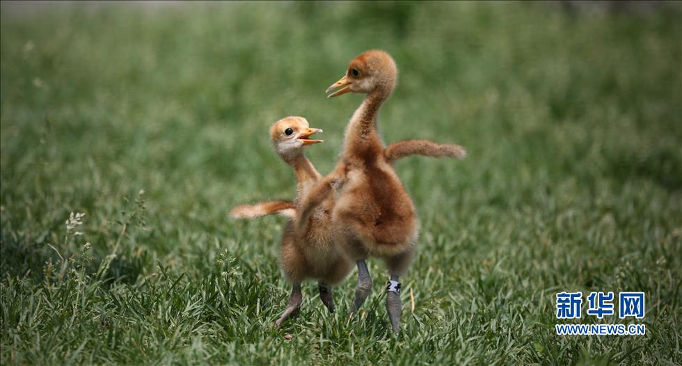 Two red-crowned cranes play outdoors on June 7, 2014. (Yao Jianfeng/Xinhua News Agency)