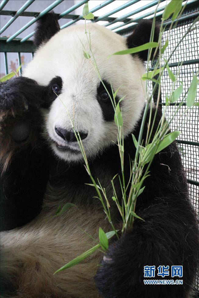 A panda named "Qing Feng" has breakfast at Yantai Zoo in Yantai City, east China's Shandong Province on June 10, 2014. The zoo splashed water for the two pandas "Qing Feng" and "Hua Ao" to keep them cool as the highest temperature in Yantai reached 29 Celsius degrees Saturday. (Shen Zhongji/Xinhua News Agency)