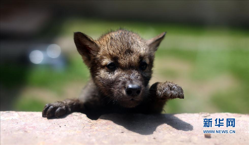 A wolf cub looks out from the wall at Shenyang Wildlife Zoo in Shenyang, Liaoning on June 4, 2014. Nine wolf cubs met with visitors in the zoo after artificial feeding for more than 50 days. (Yao Jianfeng/Xinhua News Agency)